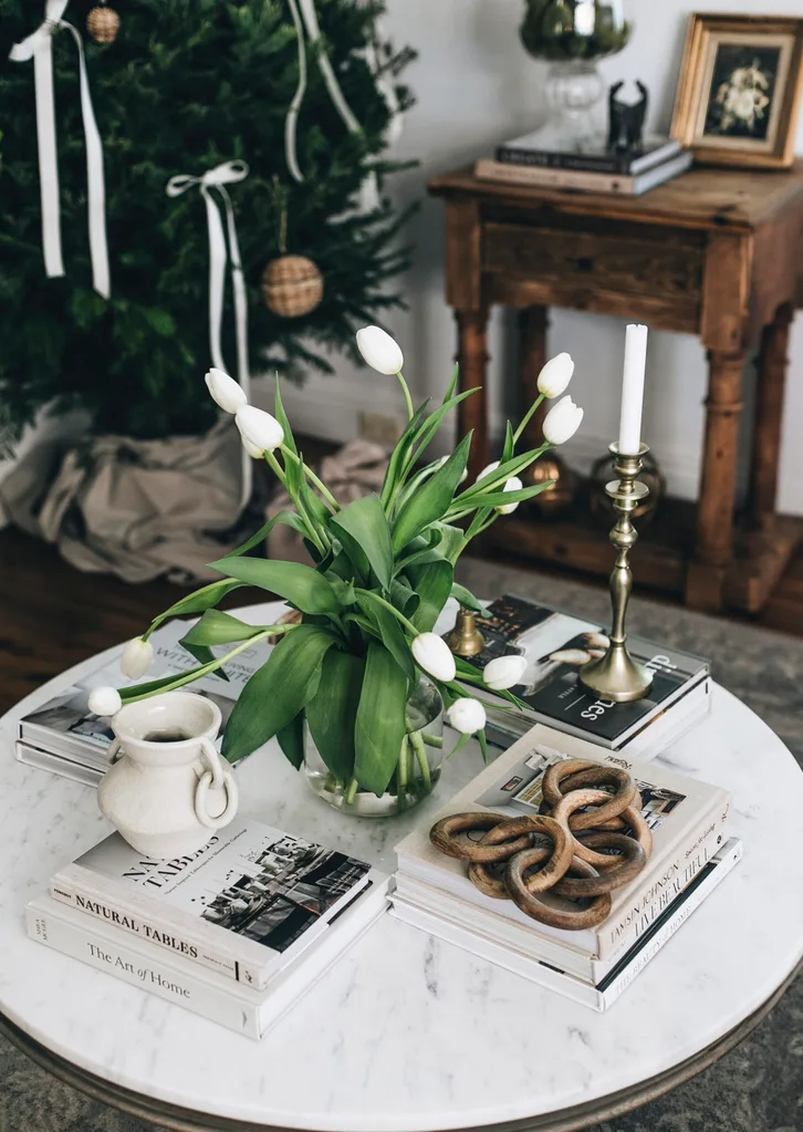A simple palette of white with silver or gold accents complements the neutral backdrop.