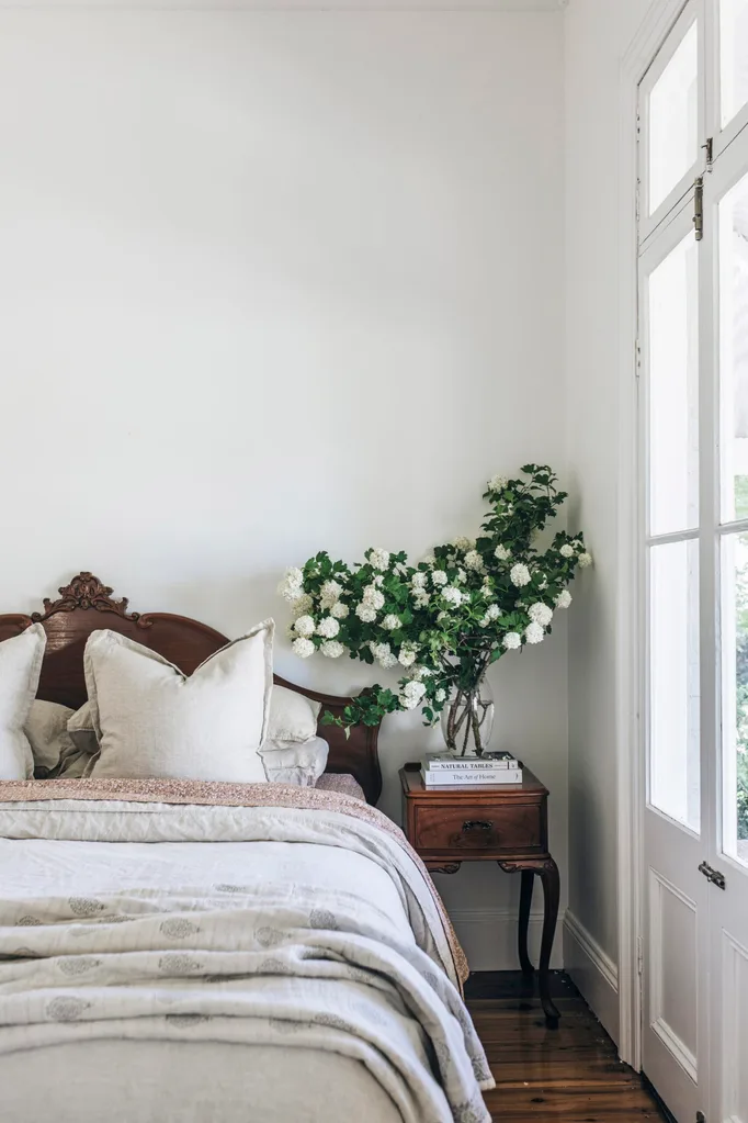 The antique bed and side table set was inherited from Ainsley’s grandmother. Branches of guelder rose fill the space.