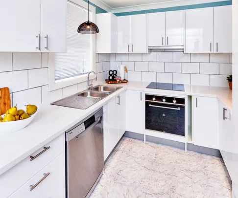 With many modern vinyl designs available these days, Renovating For Profit’s Cherie Barber used marble-look vinyl tiles in place of the original lino floor to save on expensive timber or tile costs. Maybe vinyl isn’t that bad after all…