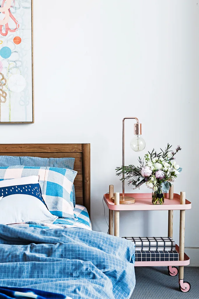 This Scandi-style trolley from Normann Copenhagen adds a fresh hit of colour to the bedroom of this playful townhouse. Photo: Maree Homer / real living