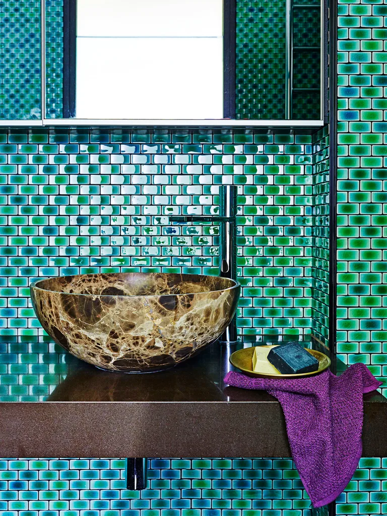 When Michelle and Robert Coppola briefed architect Scott Weston on their bathroom makeover, they asked for a dramatic update with unusual tiles – and he certainly delivered!