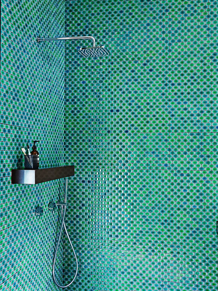 “The inspiration for the bathroom were these artisanal glazed fish scale tiles of blue and green,” Scott says. “The idea was to cocoon the entire space in floor-to-ceiling tiles of blue and green glazes.