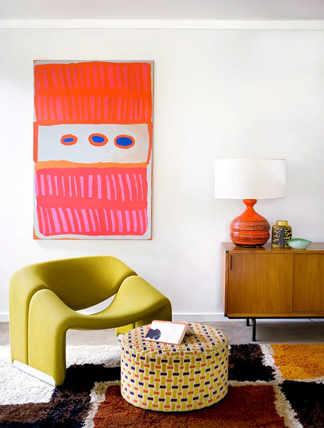 Contrast and complement. When it comes to artwork, don’t be afraid to go bold or to look outside your comfort zone. If your living space is predominately made up of a neutral colour palette, a bright piece of artwork can make a huge visual impact. Art is all about mixology. Team high street furniture with an expensive print or add a dash of colour into a Scandi-style space. Trust us, it works. Artwork by Dale Frank from Anna Schwartz Gallery. Photography: Sharyn Cairns/ bauersyndication.com.au