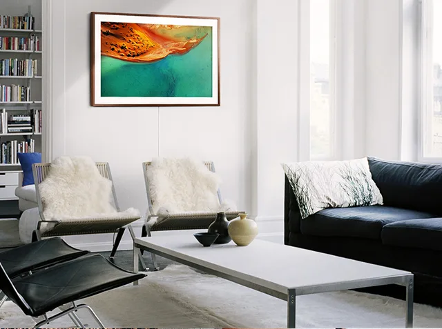 Think outside the painting. It’s important to think about how an artwork will work with your surroundings. Living rooms with larger windows, for example, can result in more glare on frames making art difficult to see. The solution? Samsung’s The Frame is designed to adjust screen brightness levels based on a room’s changing lighting, which means you’ll be able to enjoy your artwork whatever the time of day. Photography: supplied