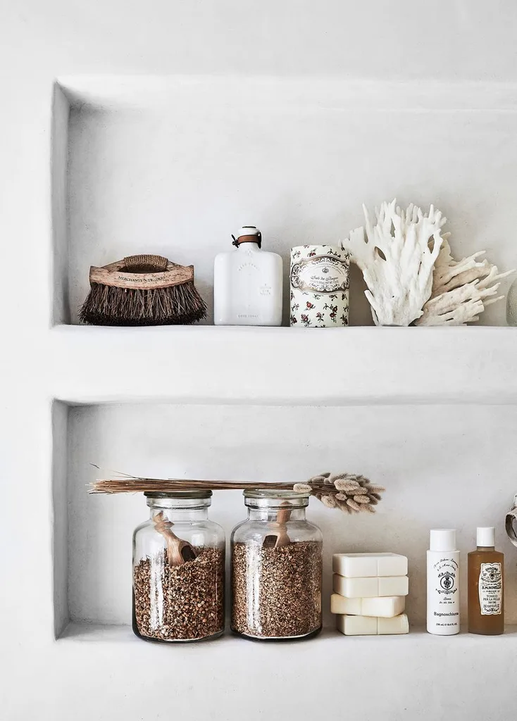 Even the shelves and bath caddy are decorated with white-palette-friendly accessories, including jars of bath tea and toiletries from centuries-old apothecary brand Santa Maria Novella.