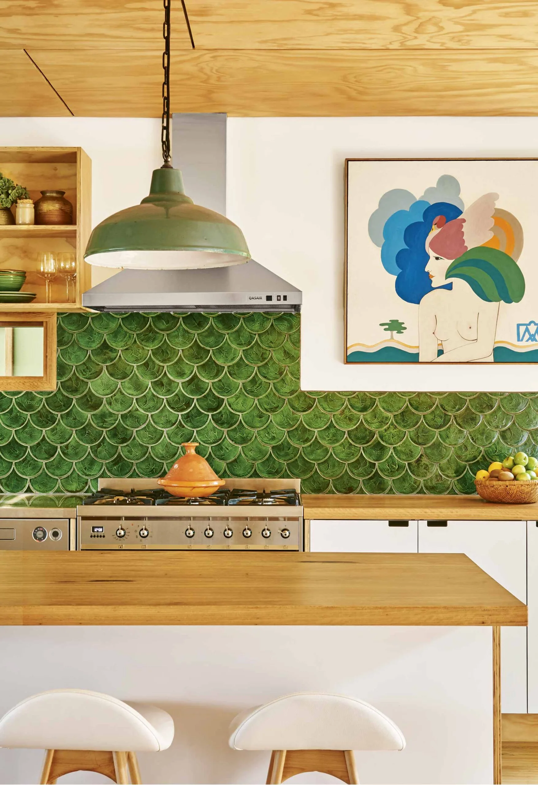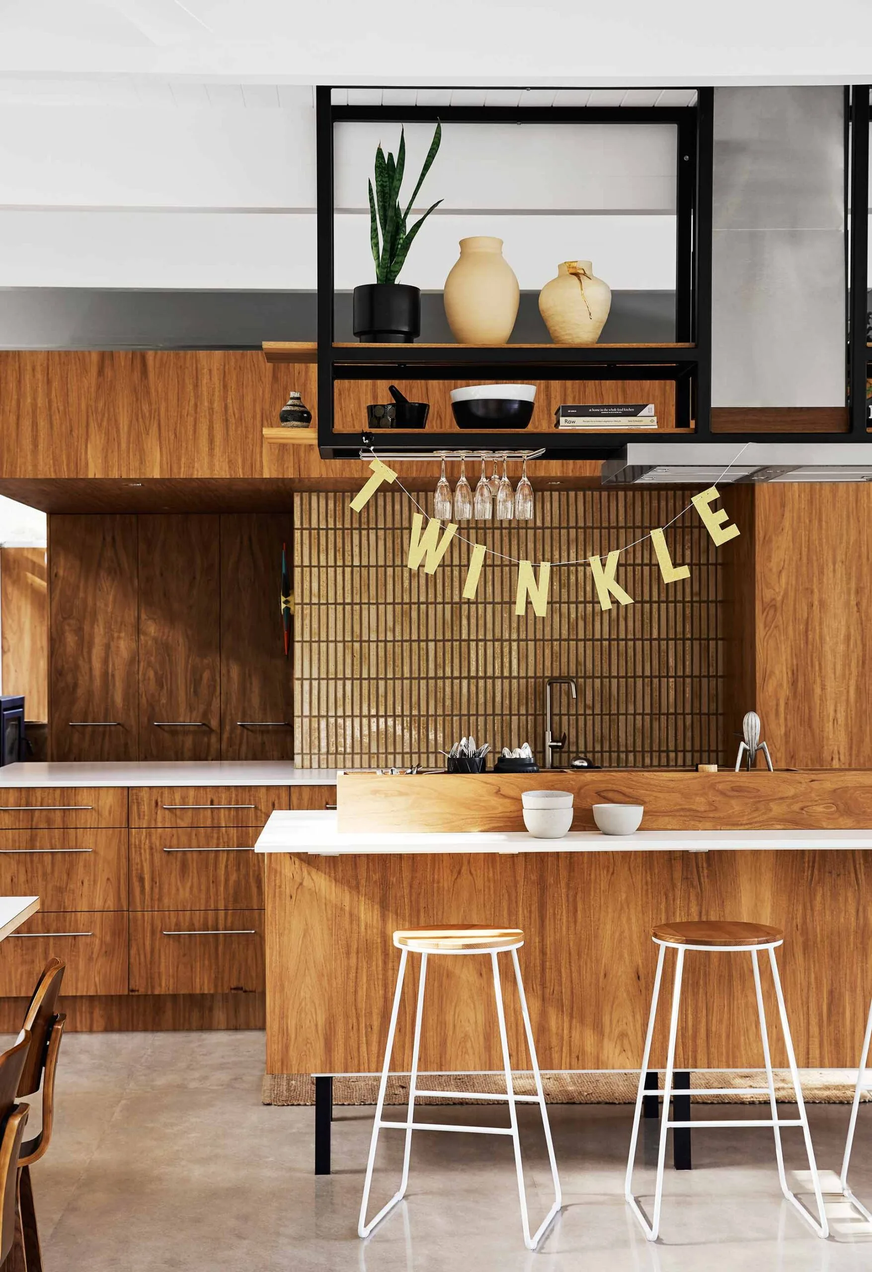 A timber benchtop in the kitchen was a natural choice for the retro-inspired revamp of this 1960s home in Torquay.
