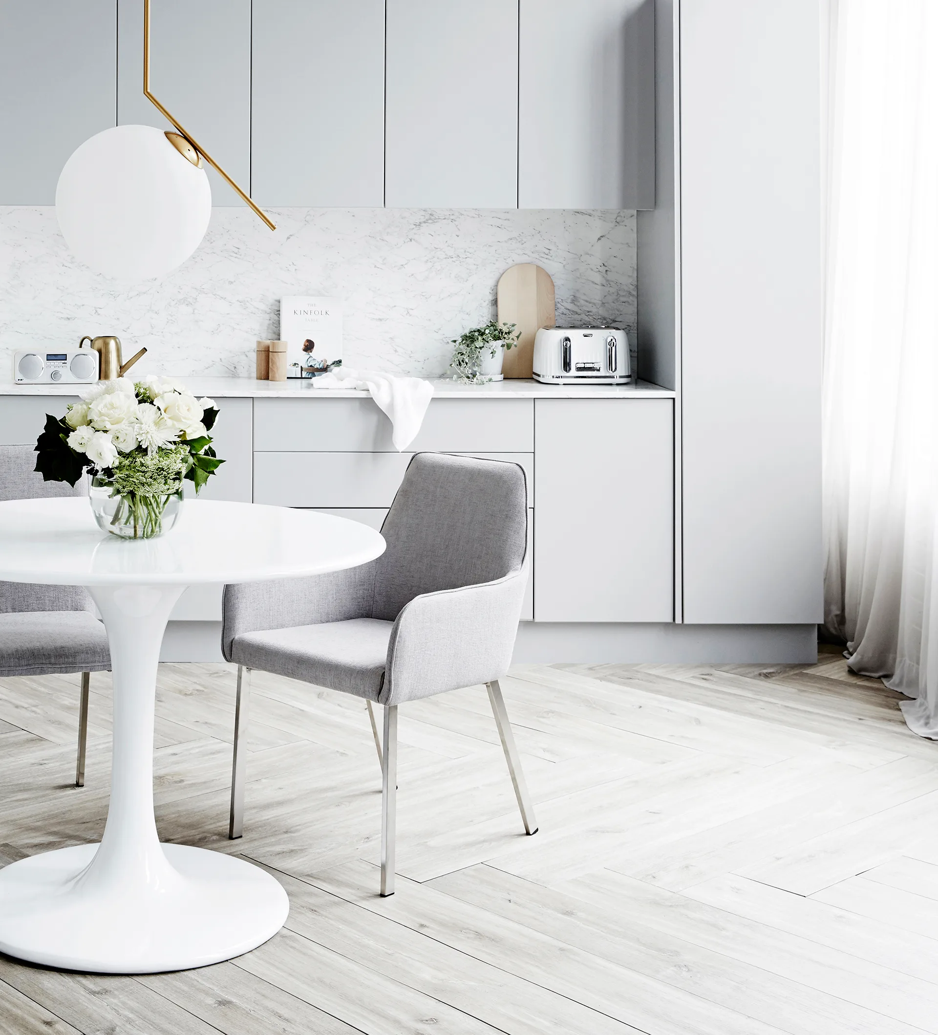 A laminate benchtop and splashback from Kaboodle Kitchen create a luxe effect in this timeless kitchen space.