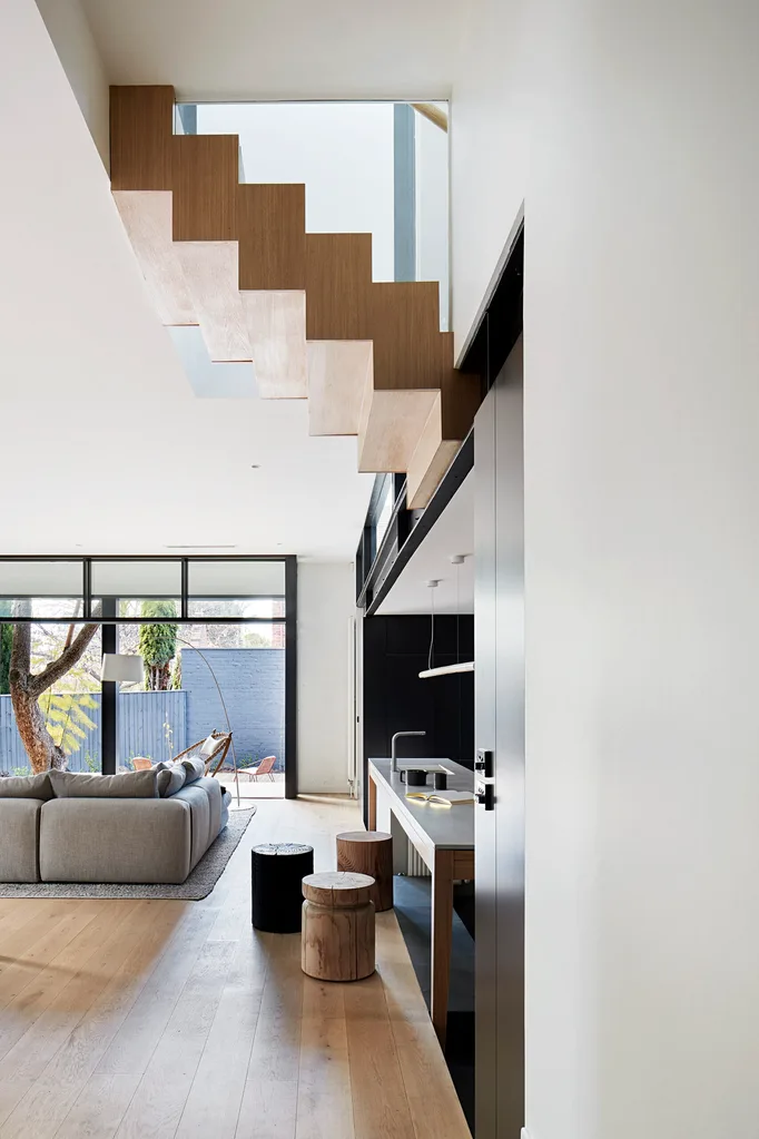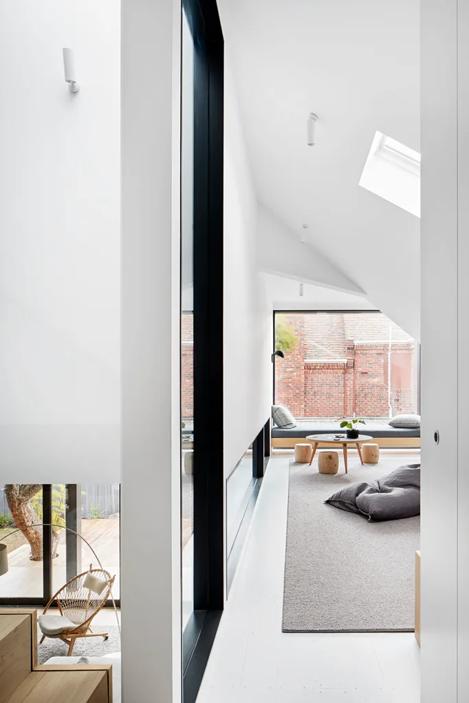 The lower level is light-filled and multi-functional, housing the kitchen, dining, and living zones. “The home is a process of discovery,” says Steven. Its architectural structure allows for glimpses into other areas of the home, creating curiosity and a desire to explore. The soaring height of the open-plan lower level allows for views into the upstairs playroom. Here, a raked and folded ceiling creates interest and drama to the interior landscape.