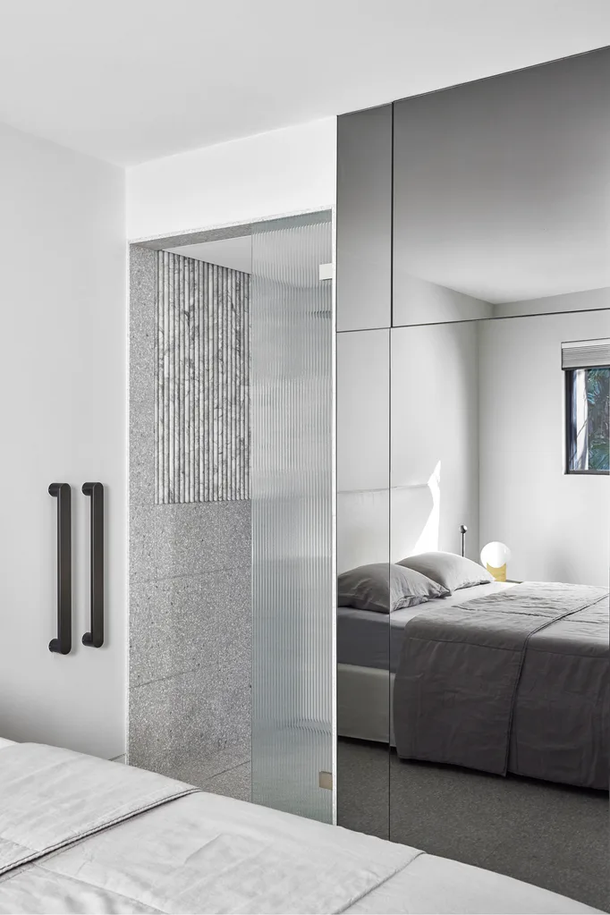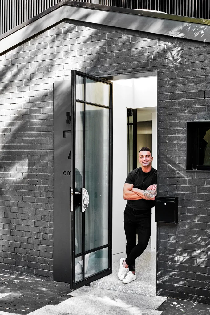 Adrian at the entry to his home. He custom made the internal doors in steel and fluted glass through Aldini to ensure spaces felt “lighter and brighter”. Marble handle from Push or Pull.