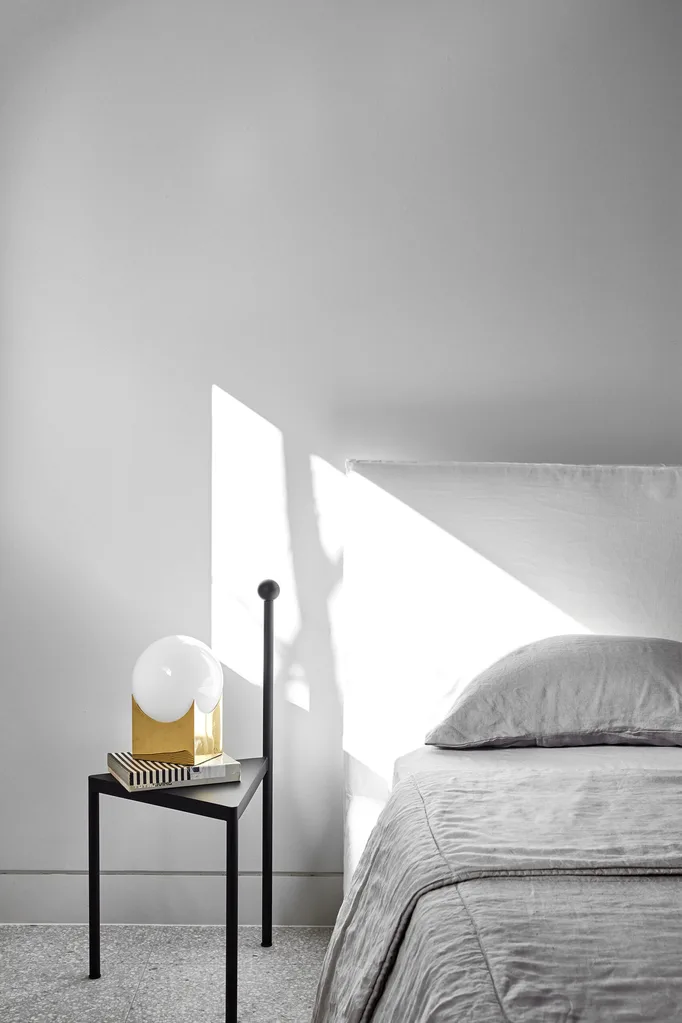 In the master bedroom ‘Joe’ bed in Italian white linen from MCM House. Roll & Hill ‘Atlas 01’ lamp from Space. Quilted bedcover and pillowcases from In Bed.
