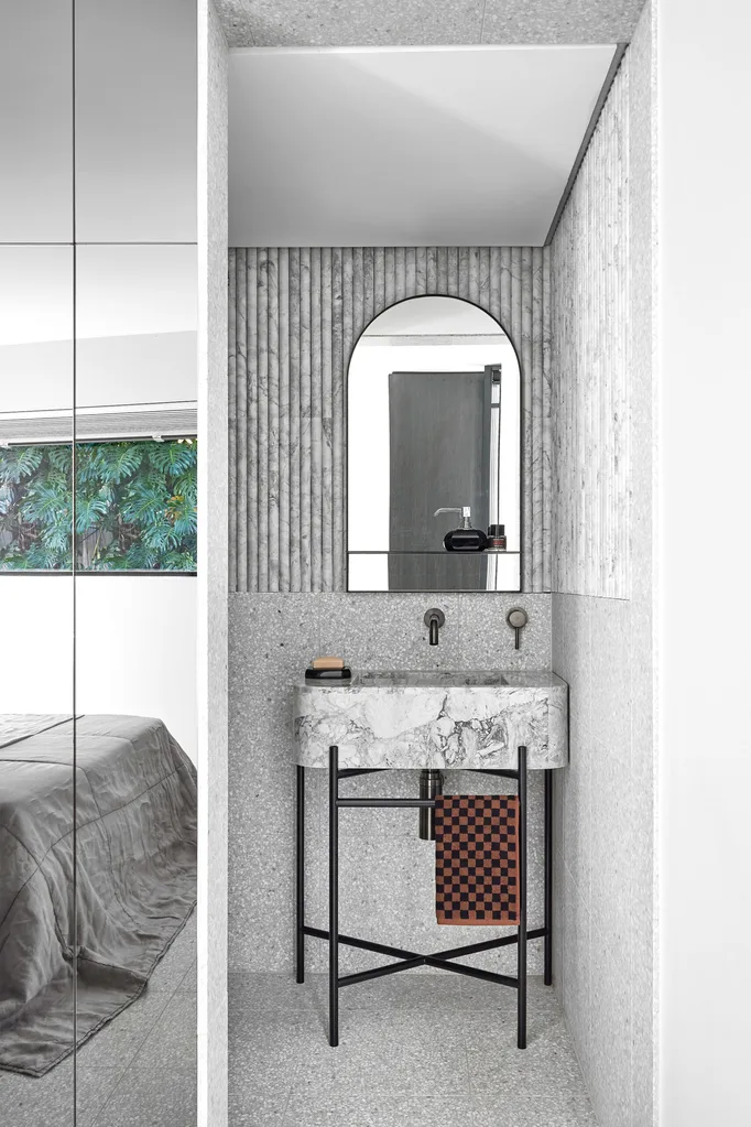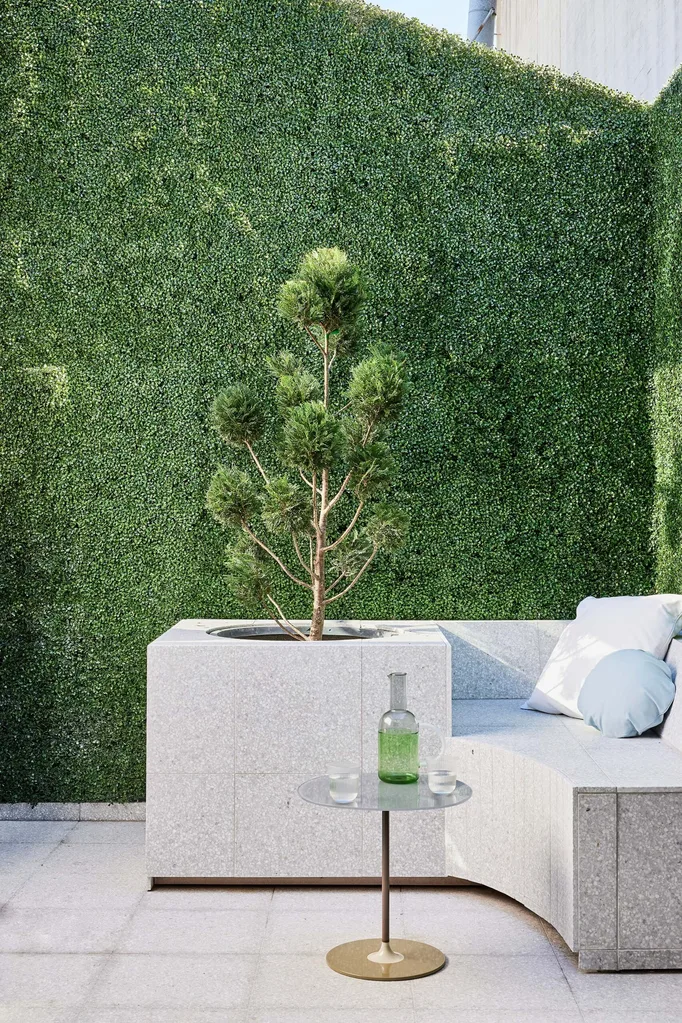 In the internal courtyard, tailored tanning bed and flooring in Italian Dove terrazzo from Surface Gallery. Kartell ‘Thierry’ side table from Space. Cloud tree sourced from The Sub Branch.