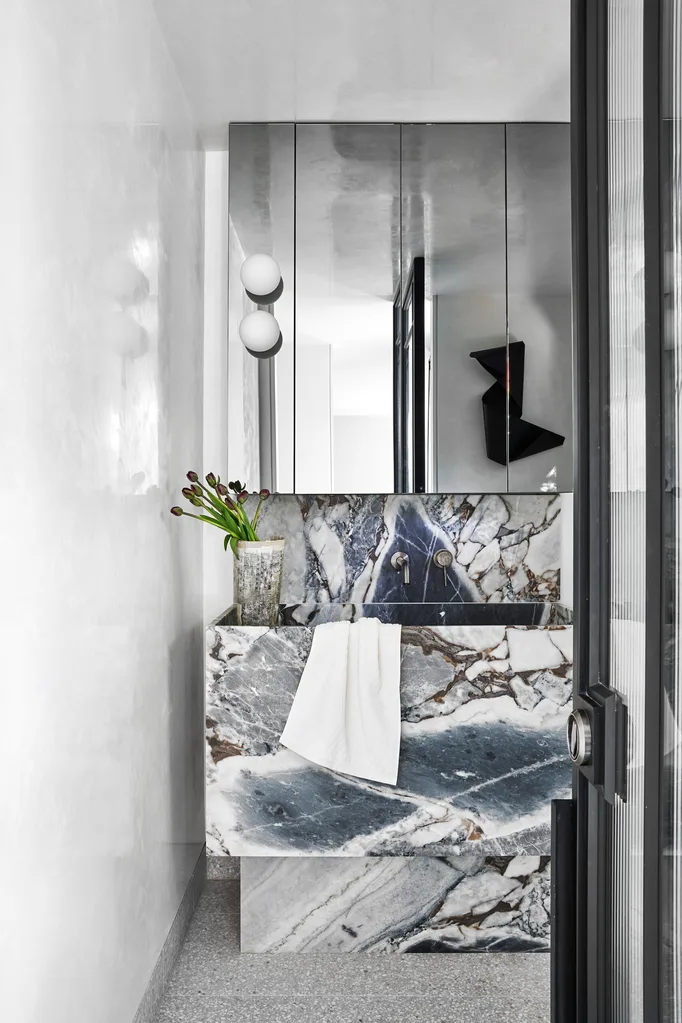 Some of my favourite pieces in the space are the bespoke marble joinery and the powder room basin. Each item that has been clad is completely unique in its own right because of the stone’s natural properties so they are completely one-offs.