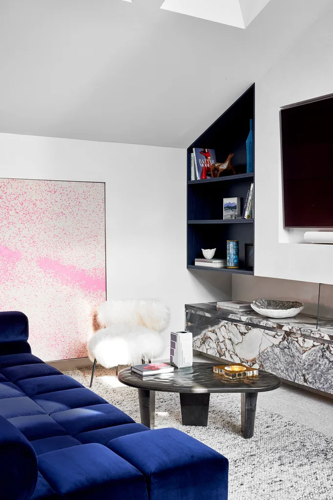 ‘Rubino’ sofa in velvet and ‘Santino’ coffee table by Aldini. Baxter ‘Nepal’ chair from Space. Zafiro Blue marble cabinet and Italian Dove terrazzo flooring from Surface Gallery. Artwork by Luke Chiswell. Large bowl from Studio Levine.