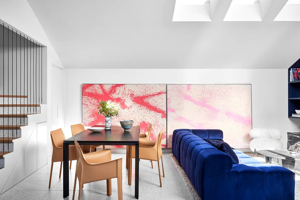 ‘Luca’ dining table and ‘Franklin’ armchairs from GlobeWest. ‘Rubino’ sofa from Aldini. Luke Chiswell artwork. Terrazzo floor from Surface Gallery.