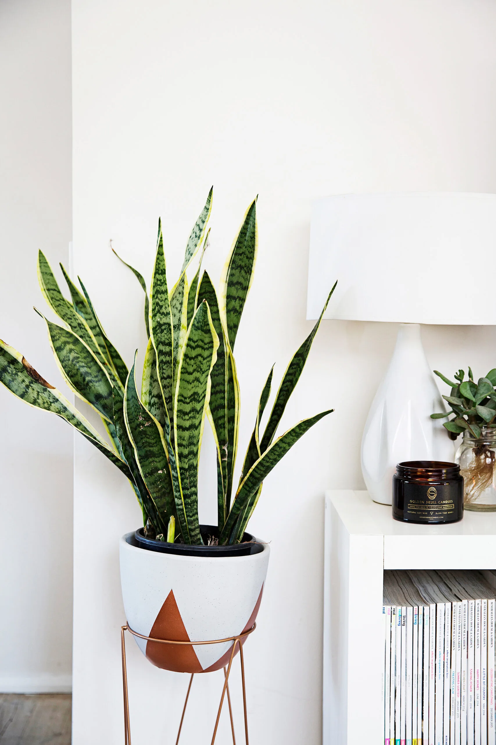 Snake plants thrive on neglect and require very little water and sunlight making them the perfect winter companion or year-round companion for the not-so green thumbed. You can leave it in your bedroom with low light, only watering it occasionally, and it will continue to thrive.