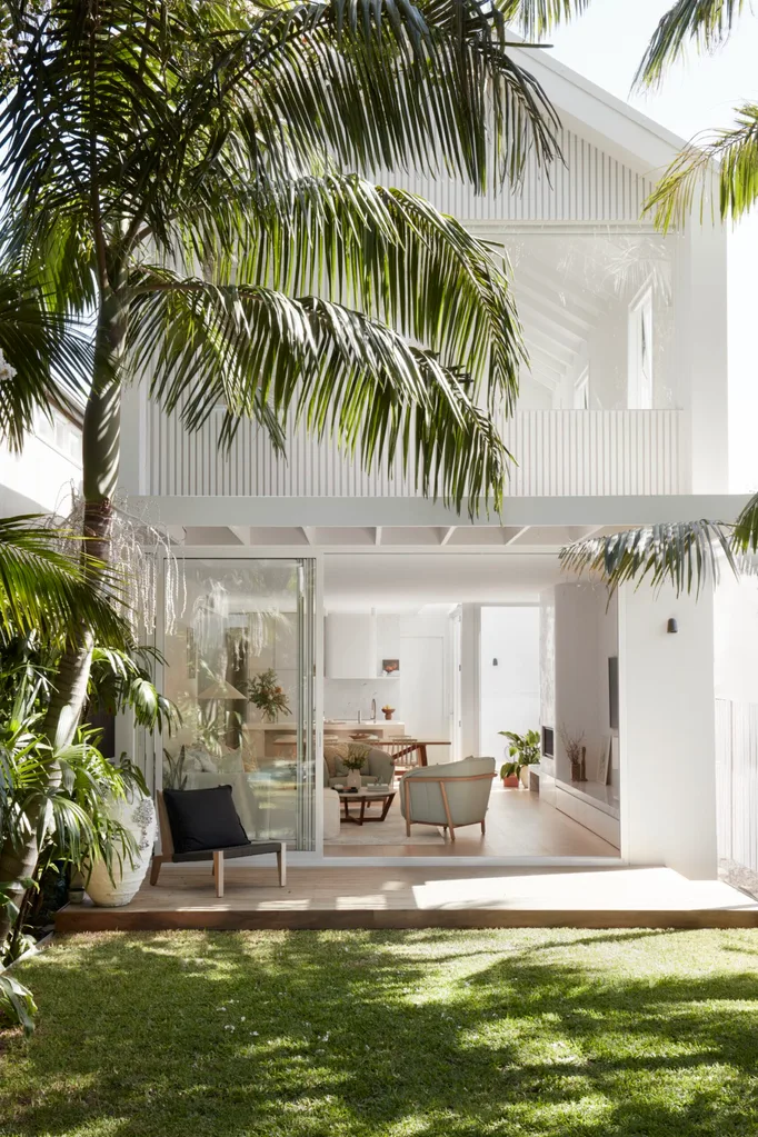 She moved the stairs to the party wall and added two more bedrooms and a sitting area upstairs. “We essentially created a whole new level.” The generous main bedroom suite at the rear includes a picture window looking into the palm-tree canopy, a raked timber ceiling and a fan to complete the tropical ambience.