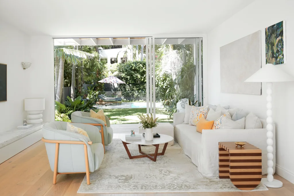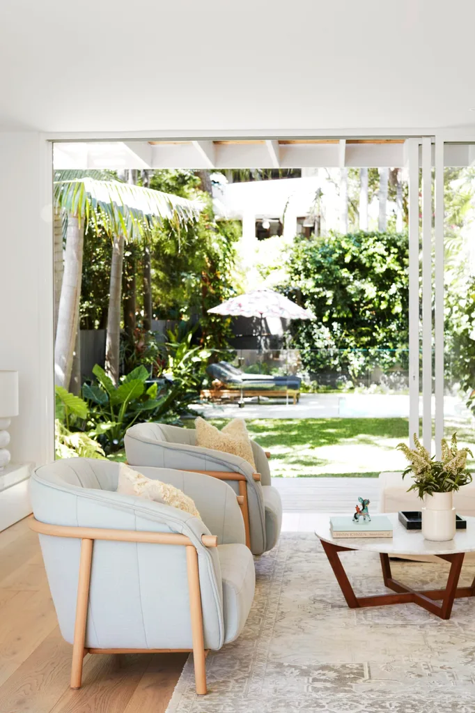 Indoor and outdoor spaces blend into one, thanks to the wall of sliders. Bosc Yas armchairs bought in London. Coffee table, Urban Couture. Sophia rug, Coco Republic. Vase, Country Road. Boule lamp, MCM House. Walls painted Taubmans Crisp White. White Smoked engineered-oak flooring, Royal Oak Floors.
