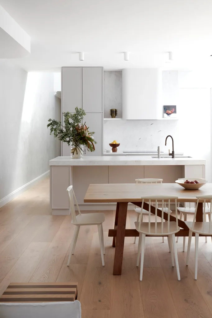 Heerenhuis ‘Larbus’ oak table and Hay J77 dining chairs, all The Conran Shop, UK. Joinery by Beckton Joinery. Padilla brass hardware, Signature Hardware. Whispair rangehood finished in Marmorino Venetian plaster by Ludi Braga. Gaggenau cooktop and oven, and Zip ‘G5 HydroTap’, all Winning Appliances. Brodware ‘Manhattan’ tapware, Shire Bathware. Havit Lighting ‘Nella’ downlights, Cosmo Lighting. Splashback and benchtop in Elba White marble, Marble Hub, made by Number One Marble & Granite. Odette teak bowl, McMullin & Co. Little Red Rooster artwork, by Rowena Dean, Paper Pear.