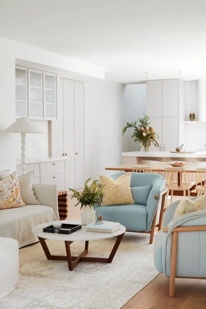 Two duck-egg blue armchairs, also bought by the couple while they were living in the UK, set the tone in the living area. “I built the whole room around them and an Indigenous artwork by Kathleen Ngale that has a delicate palette of soft pinks, peaches and whites,” says Alex. “I love those chairs, because they’re different and individual. Same with our Belgian oak dining table. Super solid and free-form, it was bought in the hope that someday it would fit somewhere.”