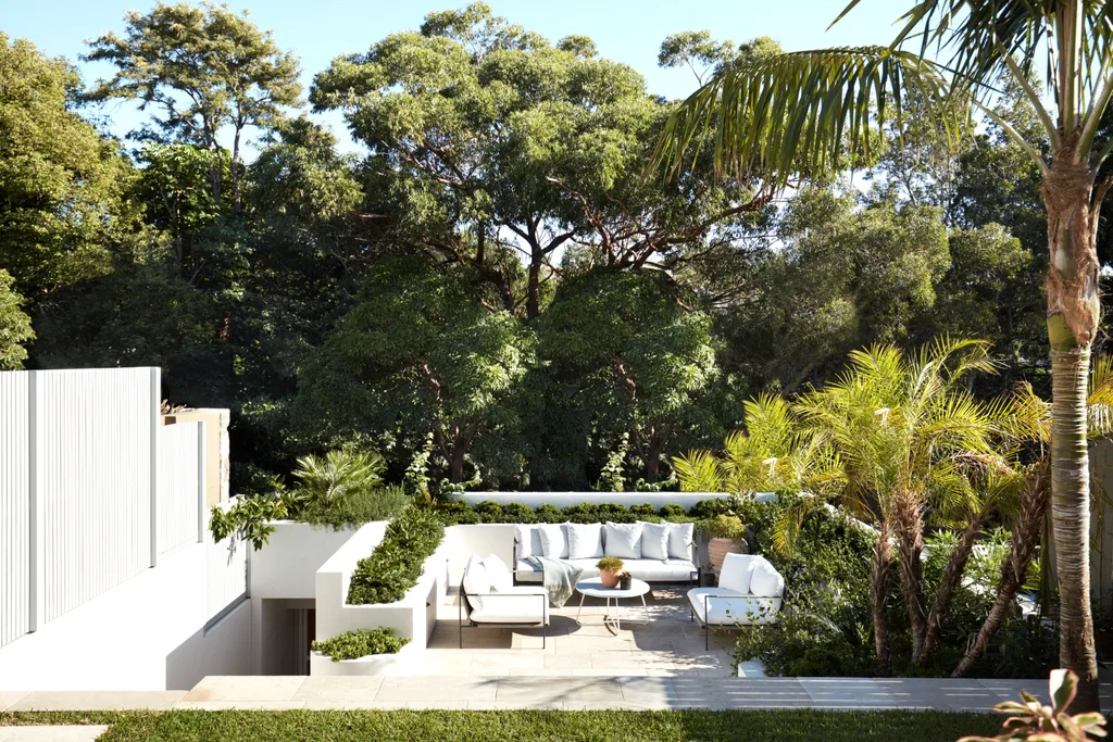 Regent concrete indoor/outdoor dining table, Malmo dining chairs and large planter, all Coco Republic. Herb urn, Anthropologie. Pink planter, The Pot Warehouse. Beauford sandstone pavers, Eco Outdoor. Exterior painted Dulux Pearl Ash Quarter. Bamboo panelling, House of Bamboo.