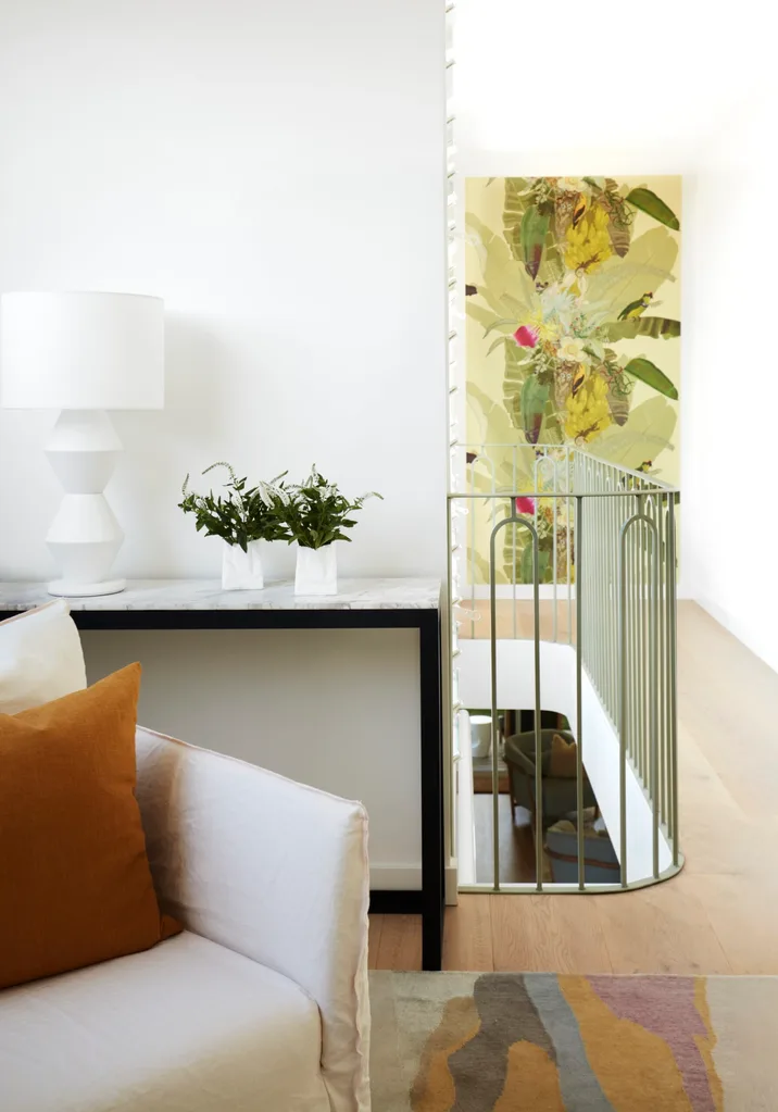 “I love green and pinky purple grey tones. Green, so soothing, is basically a neutral and easy to use, so I matched the steel balustrade to an old sample pot of Farrow & Ball paint I bought years ago and still had lying around.”