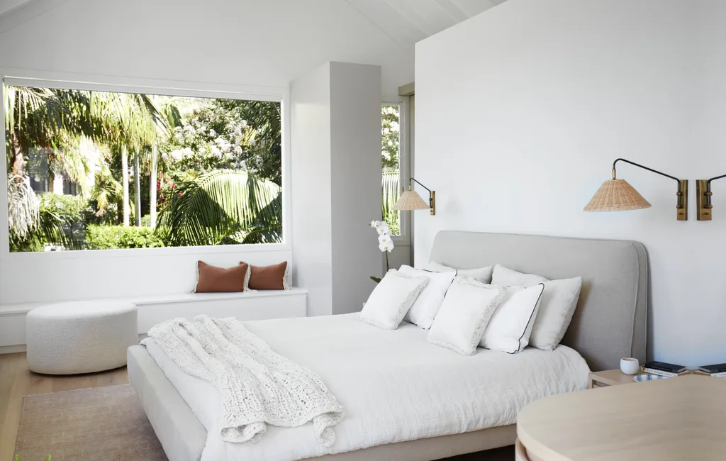 The main bedroom looks directly into the palm-tree canopy, thanks to a new picture window with an enticing bench seat beneath. Bedding by The White Company and Lucy Montgomery. Cushions under window in Copper linen, Land Home. Custom bedsides by Beckton Joinery. Flynn wall sconces, Serena and Lilly. Coast ottoman, Jardan. Paragon rug, Armadillo. Walls and ceiling painted Taubmans Crisp White.