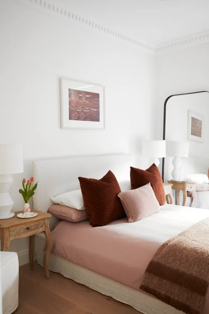 Joe bed, Cuzzi II lamp and Soho floor mirror, all MCM House. Cushions and Brae quilt cover, Country Road. Pillowcases, Sheridan. Alpaca check throw, Seed Heritage. Mimi oak bedside tables, Loaf UK. After Rain artwork by Kane Alexander, Jardan.