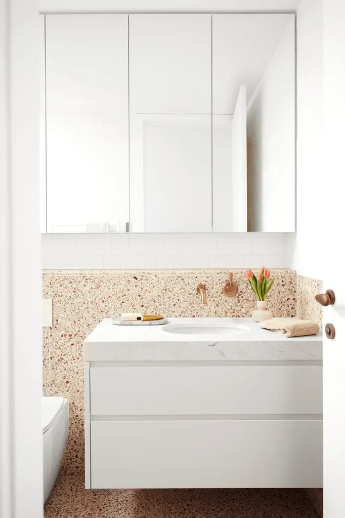 Vanity finished in Taubmans Crisp White, topped with Elba White marble. Arterrazzo Rosaio terrazzo floor and wall tiles, Artedomus. Flower vase, Marimekko. Kai tray, Seed Heritage.