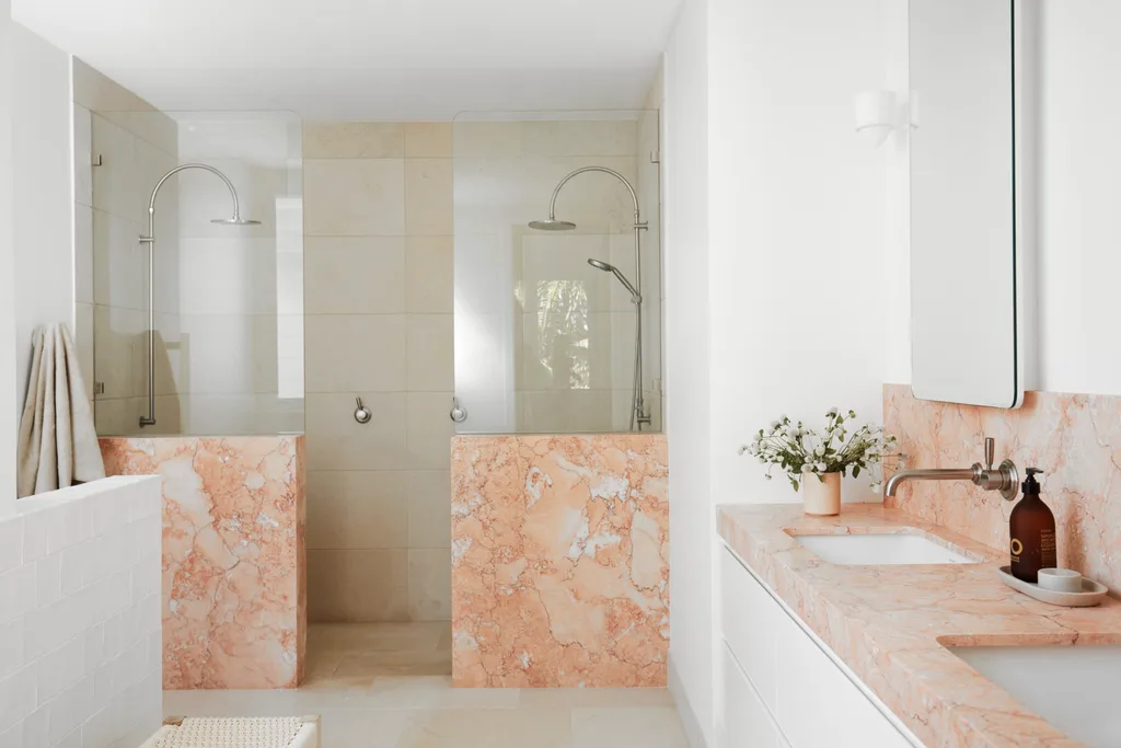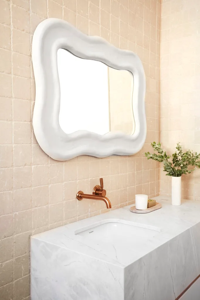Onda mirror, Lucy Montgomery X Jardan. Custom vanity in Elba White marble and Porter’s Paints Tutu. Botticino Cobblestone wall tiles, Elba White marble wall tiles, Portagallo Cobblestone floor tiles and Rosso Verona Cobblestone floor tiles, all Aeria Country Floors.