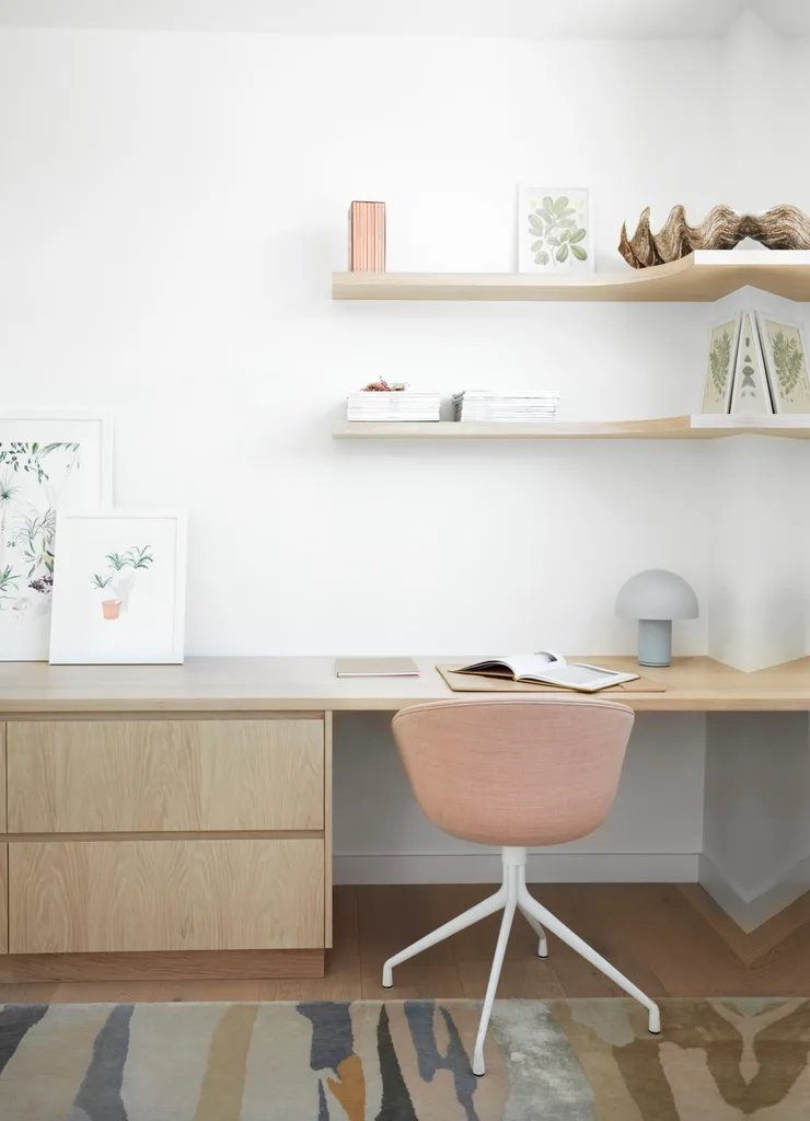 About A Chair desk chair, Hay. Custom American oak joinery. Rug, Jardan. Cosh table lamp, Freedom. Barbican Plant (large) and The House Plant (small) artworks by Alicia Galer.