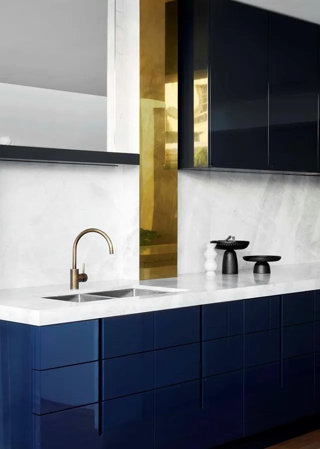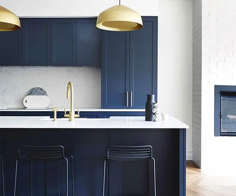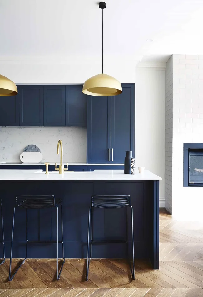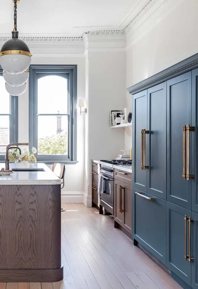 In this renovated Edwardian semi rich blue kitchen cabinets add a contemporary touch to the heart of the home. The shaker profile of the cupboards lend a classic look to the space, with gold tapware pairing beautifully with the statement Ross Gardam pendant lights.