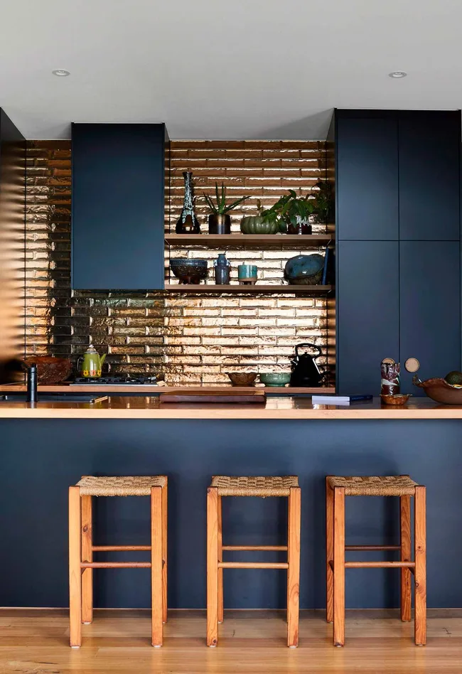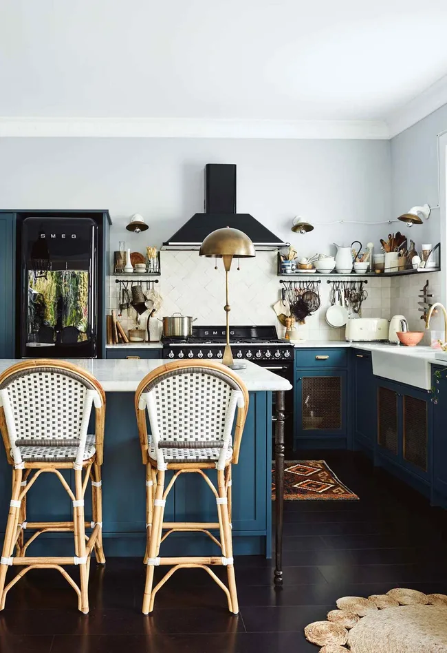 The Moroccan-style encaustic tiles on this splashback add a bohemian twist to this mostly dark-toned kitchen. The dramatic pattern is complemented by the soft grey benchtops and deep blue cabinetry.