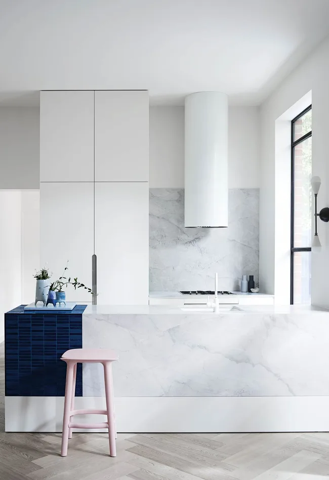https://htl.staging.digital.aremedia.com.au/updated-edwardian-residence-21147|target=”_blank”). The tiled section on the end of this peninsula bench adds a dramatic contrast of colour and materiality. It also allows for a styling moment and a place for the eye to rest.