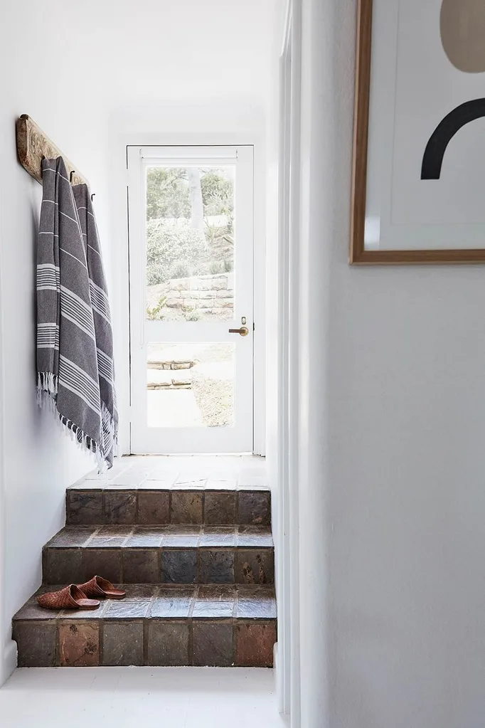 Vintage hooks decorate the entryway – it’s the perfect place to hang towels, school bags or hats in a neglected holiday home is transformed into a rustic coastal haven.
