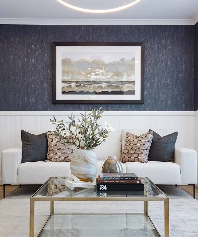 At Kinley Estate in Lilydale, the living room of this Balmoral design puts a feminine twist on Hamptons style—proving that each space can truly be personalised to suit your unique style. A gentle grey rug, distinctive wallpaper, and an organic overhead pendant bring texture and movement to this sprawling, elegant room.