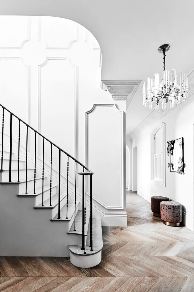 The tone is set at the entrance where classic black-and-grey chequerboard tiles give way to oak chevron parquetry in the grand entry foyer with its sweeping restored marble and curved brass-railed staircase.