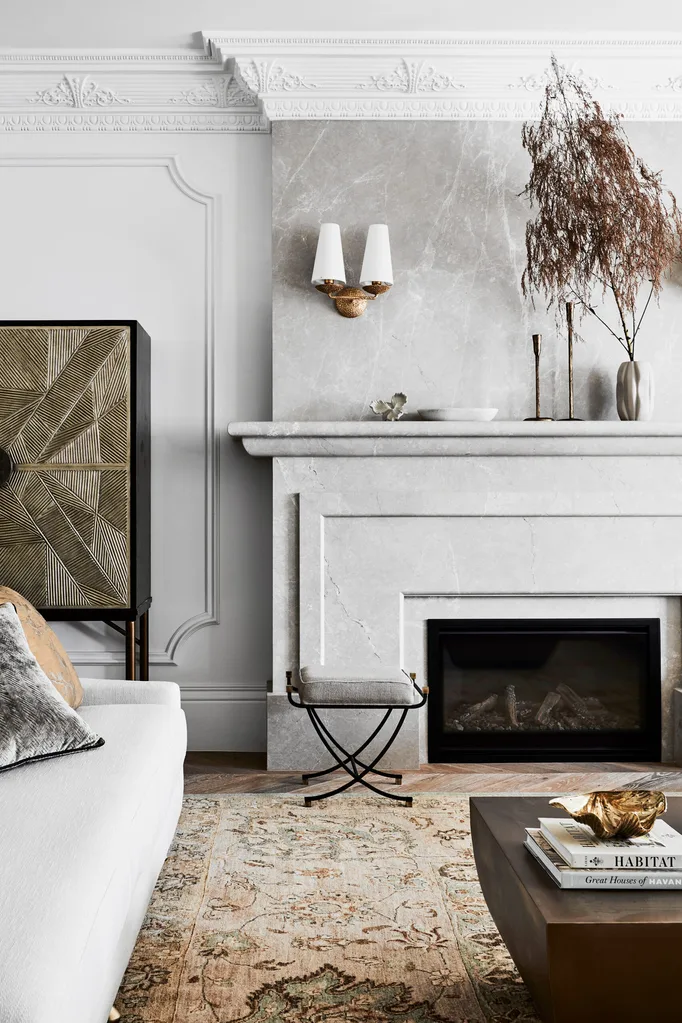 Custom sofa by Studio Kate from Boyd Blue has custom cushions in James Dunlop fabric from Mokum and Lizzo fabric from Westbury Textiles. Palecek ‘Callahan’ cabinet and Arteriors ‘Felice’ small bench, both from Boyd Blue. Café au Lait marble fireplace surrounds from Granite & Marble Works with an Escea DF960 fire from The Heater Man. Visual Comfort ‘Fontaine’ double wall sconce from Bloomingdales. ‘Sultan’ vintage rug from Robyn Cosgrove. ‘Float’ vase from BoConcept. Foliage from Mandalay Flowers. Accessories from CASA by Kate Nixon.