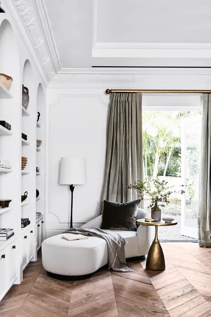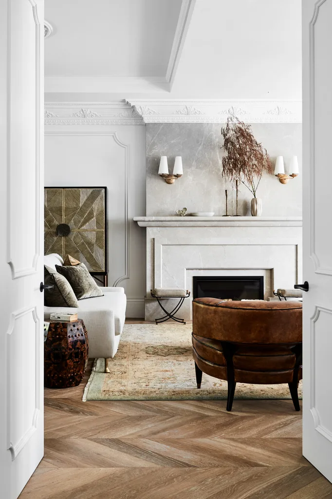 A symphony of furniture pieces including a custom-designed sofa by Studio Kate, a ‘Laurent’ armchair and ‘Felice’ small bench, both by Arteriors, and Palecek ‘Callahan’ cabinet, all from Boyd Blue, are arranged in the formal living room around a new Escea ‘DF960’ fireplace from The Heater Man with Café au Lait marble surrounds from Granite & Marble Works. Maitland Smith ‘Qing’ side table from Laura Kincade. Visual Comfort ‘Fontaine’ double wall sconces from Bloomingdales. Bespoke cushions in James Dunlop fabric from Mokum and Lizzo fabric from Westbury Textiles. A vintage ‘Sultan’ wool rug from Robyn Cosgrove covers the chevron parquetry floors from Precision Flooring. Walls in Porter’s Paints ‘Cashmere’ half-strength. ‘Float’ vase from BoConcept. Foliage from Mandalay Flowers. Accessories from CASA by Kate Nixon.