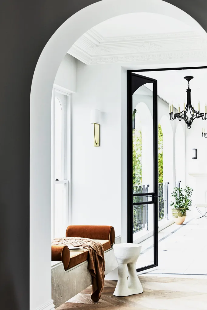 It is just one of the spaces in the home the owner describes as “more than beautiful and beyond our expectations”. The dining room is separated by new steel-framed fluted glass doors from the kitchen, another favourite space with its hand-painted biscuit-hued joinery and horn handles, arched steel windows and backlit onyx slab in the wet bar.