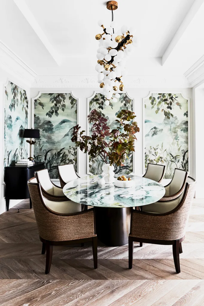 The decorative details add finesse and polish. In the dining room, the drama of a Designers Guild mural wallpaper framed in mouldings is complemented by a spectacular Murano chandelier suspended over the custom marble and brass dining table, giving even everyday dining a sense of occasion.