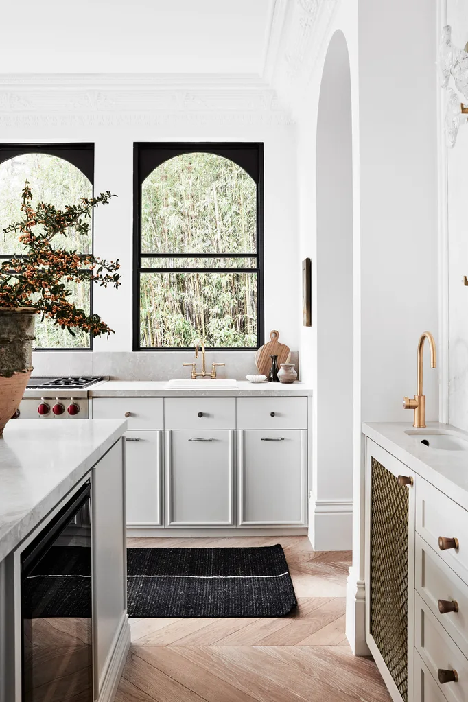 Kitchen joinery by Kreative Kitchens painted in Porter’s Paints ‘Cinnamon Sugar’ with Oxford Decorative Grilles handwoven diamond mesh from The English Tapware Company and marble benchtop from Granite & Marble Works. Brass and horn handles from Handles by Mood. Custom-designed windows by Kate Nixon from Ganci. Oven and cooktop from Wolf. Brodware ‘Neu England’ tapware and Turner Hastings ‘Cuisine’ undermount sink from Sydney Tap and Bathroomware.