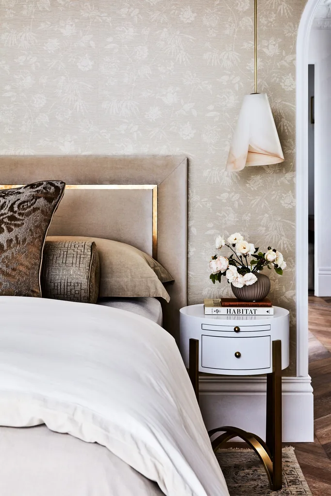 Ralph Lauren wallpaper, ‘Ellsworth Floral’ from IconRadford, provides a restful backdrop in the master bedroom. Custom bedhead by Kate Nixon in Ascraft ‘Bloom Velvet’ in Sand Dollar. Custom bedlinen in Busatti ‘Raso Egitto’. Custom cushion in Lizzo ‘Idyllic’ from Westbury Textiles. Bolster in Designers Guild ‘Palladio Natural’. ‘Midge’ circular bedside table from Bloomingdales. Derive Vienna art deco alabaster pendant light from 1stdibs. Accessories from CASA by Kate Nixon.