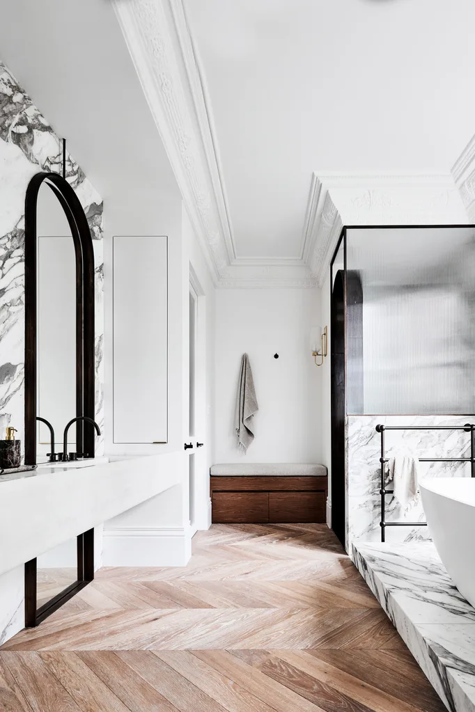 The master bathroom is a glamorous space with walls and plinth clad in Arabescato Oro marble and vanity in Café au Lait marble from Granite & Marble Works. ‘Garrison’ sconce from The Urban Electric Co. Fluted glass in a brass frame from Art of Metal. Victoria + Albert ‘Barcelona’ bath, Brodware ‘Manhattan’ tapware and Hydrotherm heated towel rail, all from Sydney Tap and Bathroomware. Custom bench seat in TrueGrain in Pinecone from Briggs Veneers with ‘Creel’ seat cushion from Janus et Cie.
