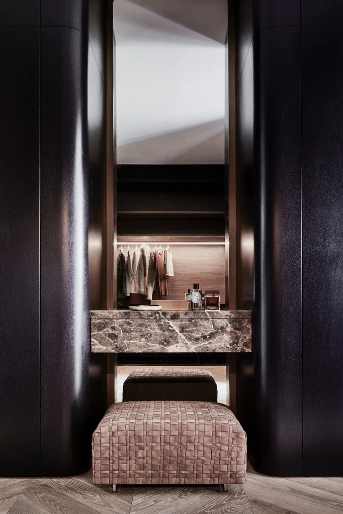 The dressing room has joinery doors in Alpi Ikat from Elton Group with vanity topped in ‘Emperador’ marble from Granite & Marble Works. Custom mirror from Art of Metal. Flexform ‘Bangkok’ ottoman from Fanuli.