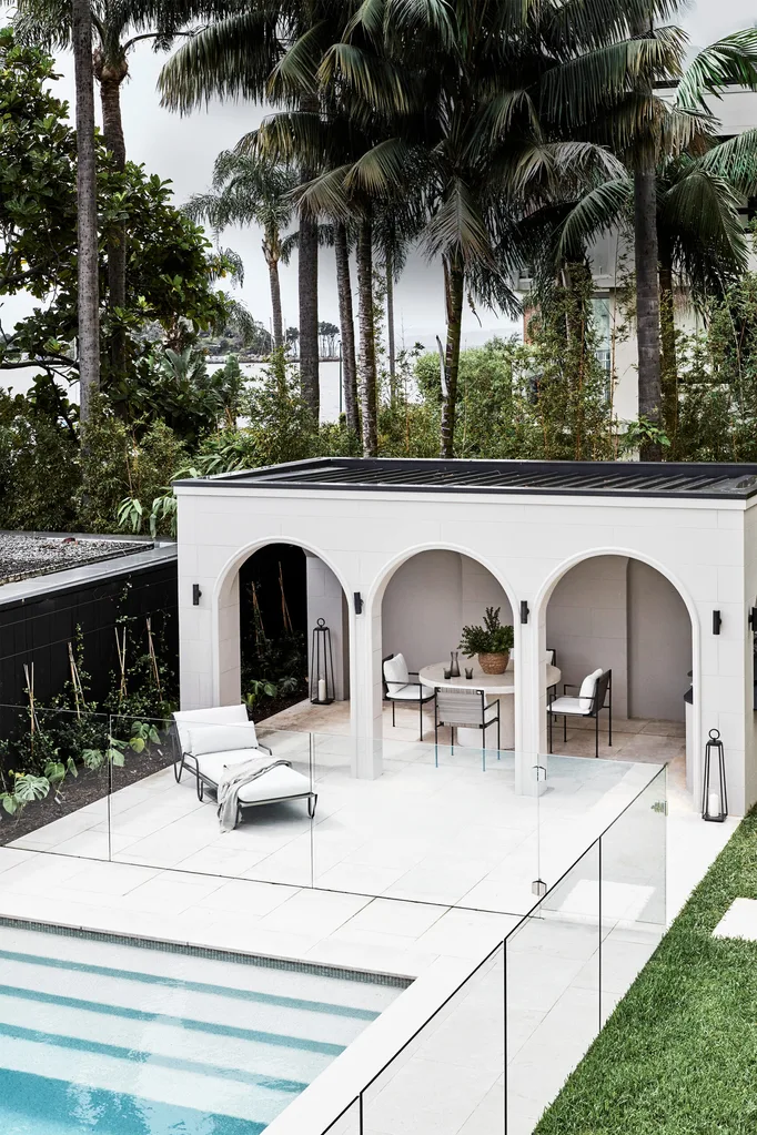 The property enjoys an enviable north-east harbourside location and the revamped swimming pool and entertaining area is a popular spot. The arch treatment on the poolhouse references arches elsewhere in the house. Outdoor furniture and lanterns, all from Coco Republic.