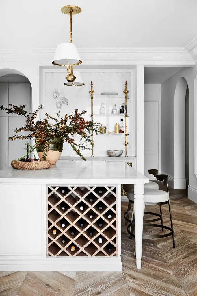 In the bar area, wine storage in TrueGrain veneer in Pinecone from Briggs Veneers. Brass bistro shelves from Wa Hoo Designs. White onyx splashback from Granite & Marble Works. ‘Chiltern Double’ pendant light from The Urban Electric Co. ‘Frankie’ bar stools from Boyd Blue. ‘Dagar’ pot from Garden Life. Foliage from Mandalay Flowers. Palecek bowl and decor accessories from CASA by Kate Nixon. ‘Collection Saturne’ cocktail bar set from Becker Minty. Walls in Porter’s Paints ‘Cashmere’ half-strength.