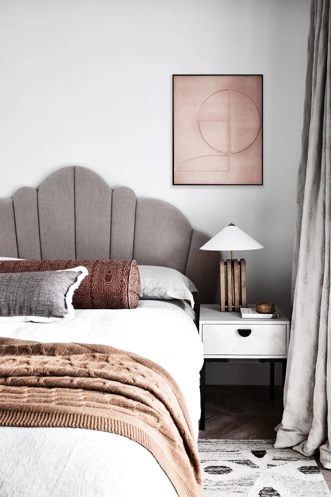 Custom scalloped bedhead in ‘Parissi’ in Shell from Warwick Fabrics. Custom bedlinen in Busatti ‘Burraco’. Cashmere throw from CASA by Kate Nixon. ‘Hertz’ bedside table from Brosa. ‘Iyah’ table lamp and wall art, both from Coco Republic.