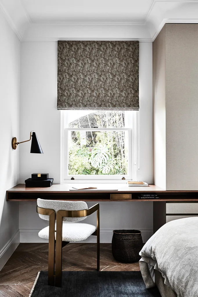 Custom desk in the third bedroom in TrueGrain from Briggs Veneers. ‘Donato’ chair in cream bouclé from James Said. ‘Dana’ wall lamp from About Space. ‘Agra’ rug from Armadillo. Roman blind in Busatti ‘Gauguin’ and duvet in ‘Burraco’. Basket and desk accessories from CASA by Kate Nixon.
